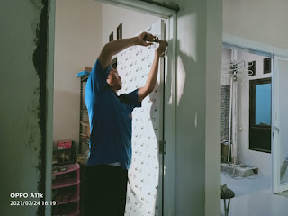 - Pasang isolasi kertas pada sekeliling kusen mengikuti bagian pinggir kusen.